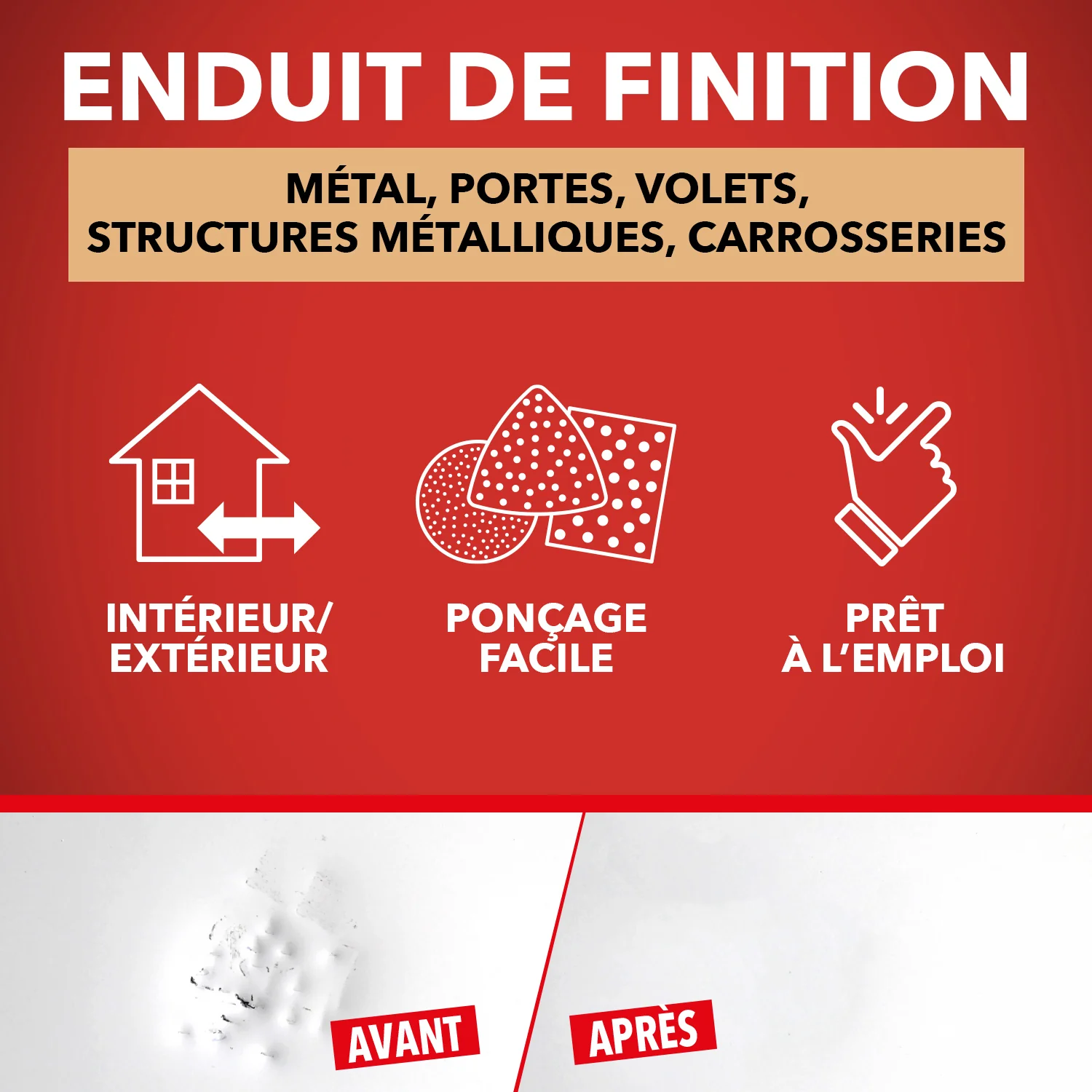 Il comble les micro-aspérités du mastic et l'isole de la peinture. L'Enduit Métal de Finition est prêt à l'emploi et permet de mieux accrocher la finition choisie en rendant la surface extra-lisse et d'une grande finesse.