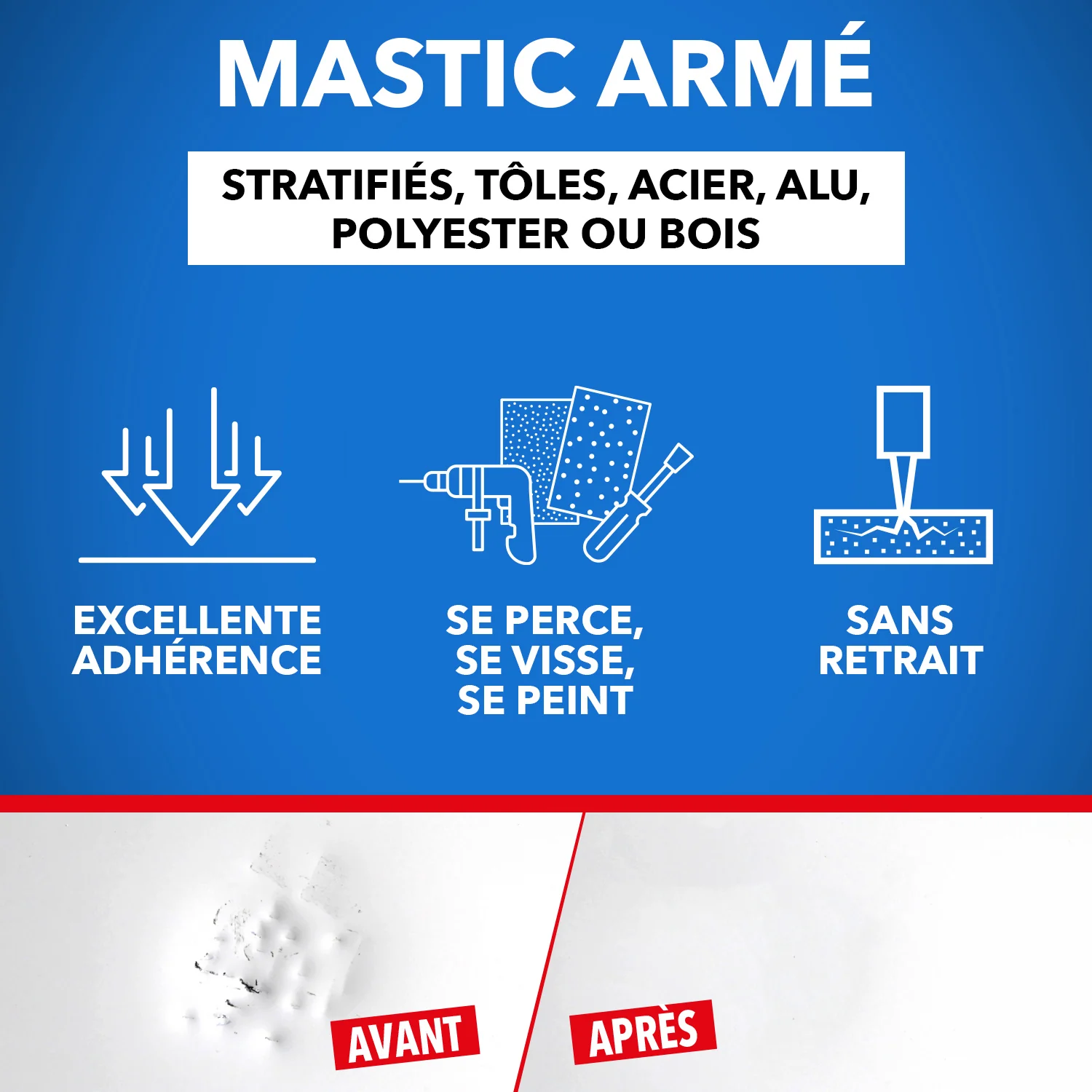 Le Mastic armé polyester rebouche les défauts importants et comble les trous sur bois, stratifié...Ce mastic bi-composants est chargé en fibres de verre et spécialement adapté pour résister aux embruns et à l'humidité.