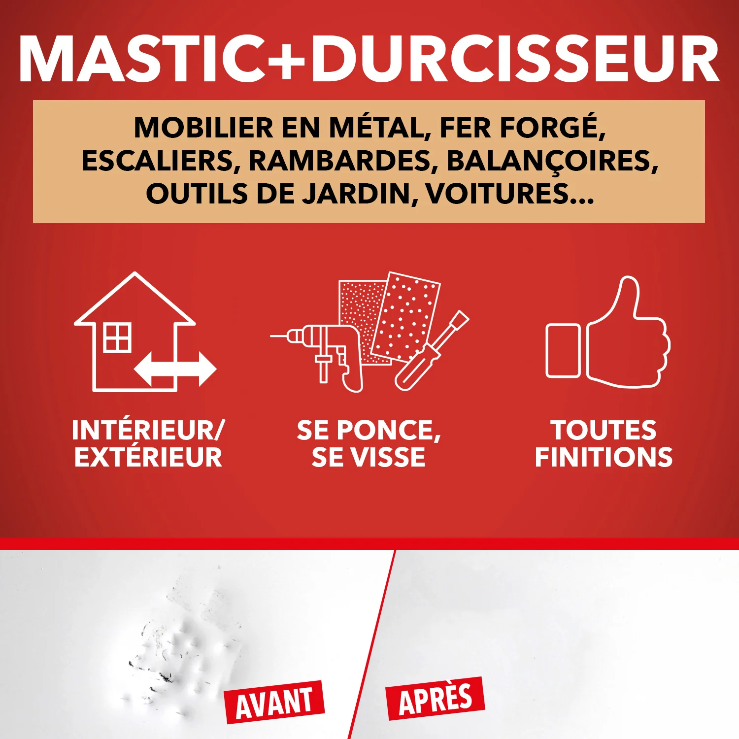 Le Répare Métal devient aussi dur que le fer, égalise les surfaces avant finition et rend la surface lisse après ponçage.