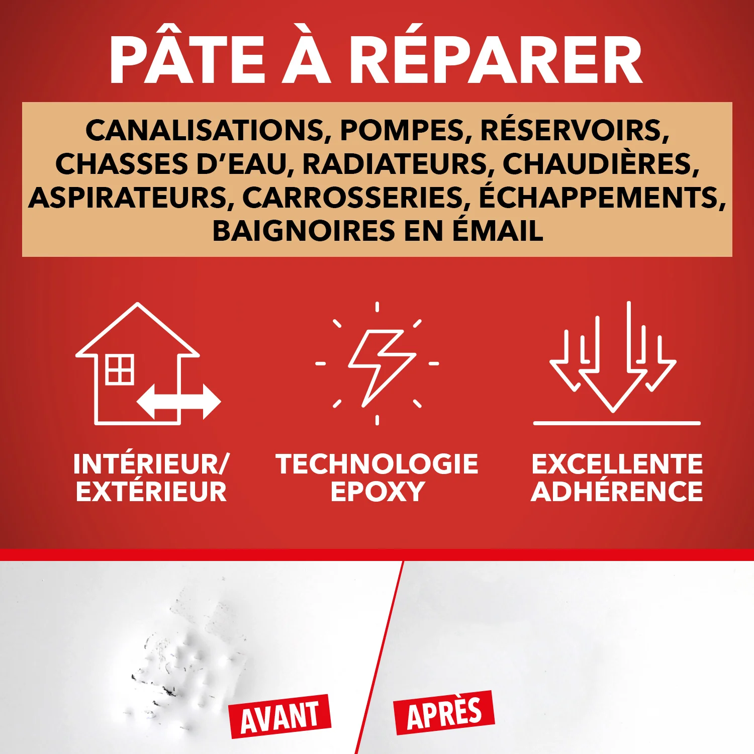 Grâce à sa technologie époxy, la pâte stoppe les fuites et résistes à la pression, aux températures extrêmes et à l'eau, en devenant solide comme du métal.