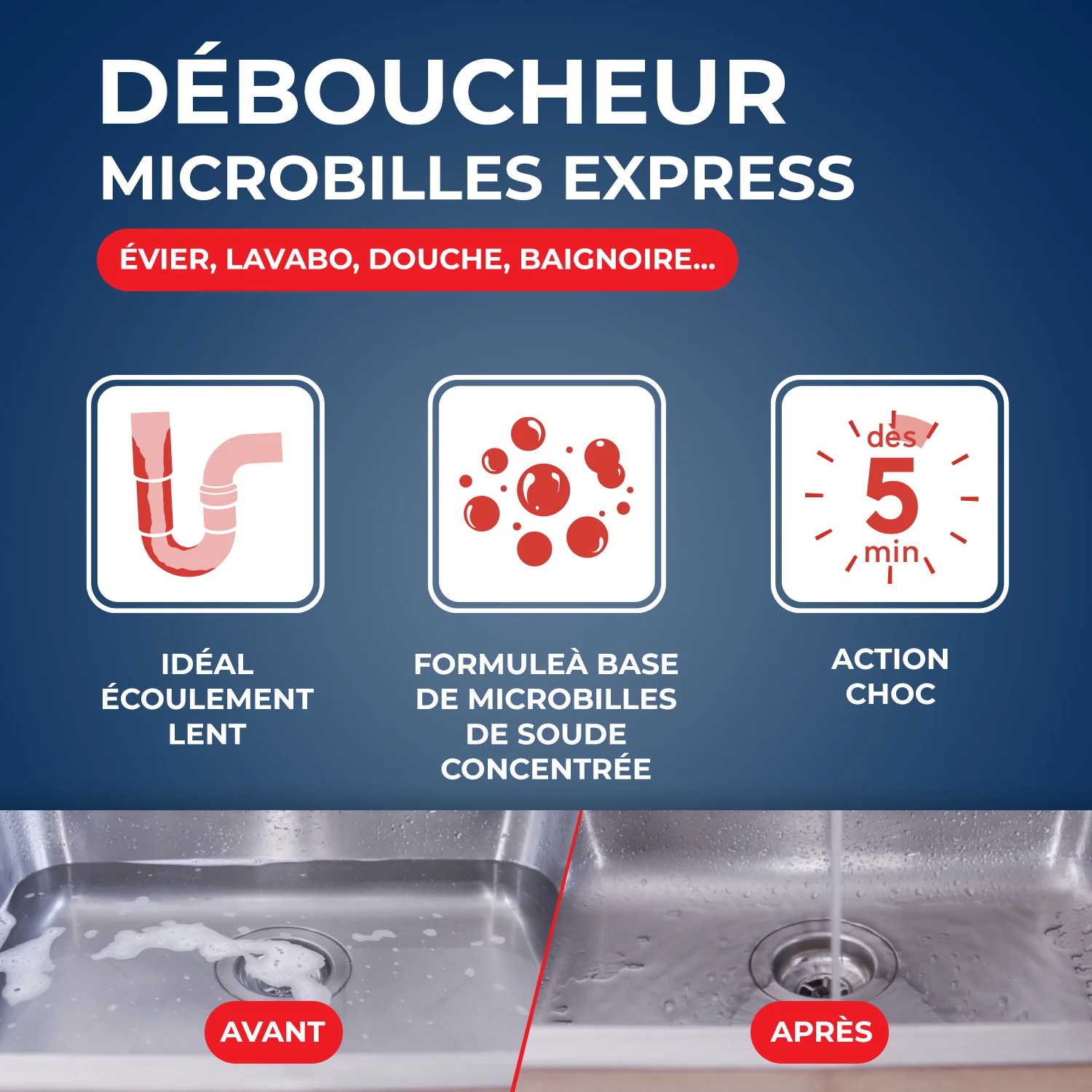 Pour le débouchage de votre baignoire, douche, lavabo ou évier Le Déboucheur microbilles express est conçu pour le débouchage des éviers, lavabos, douches et baignoires.