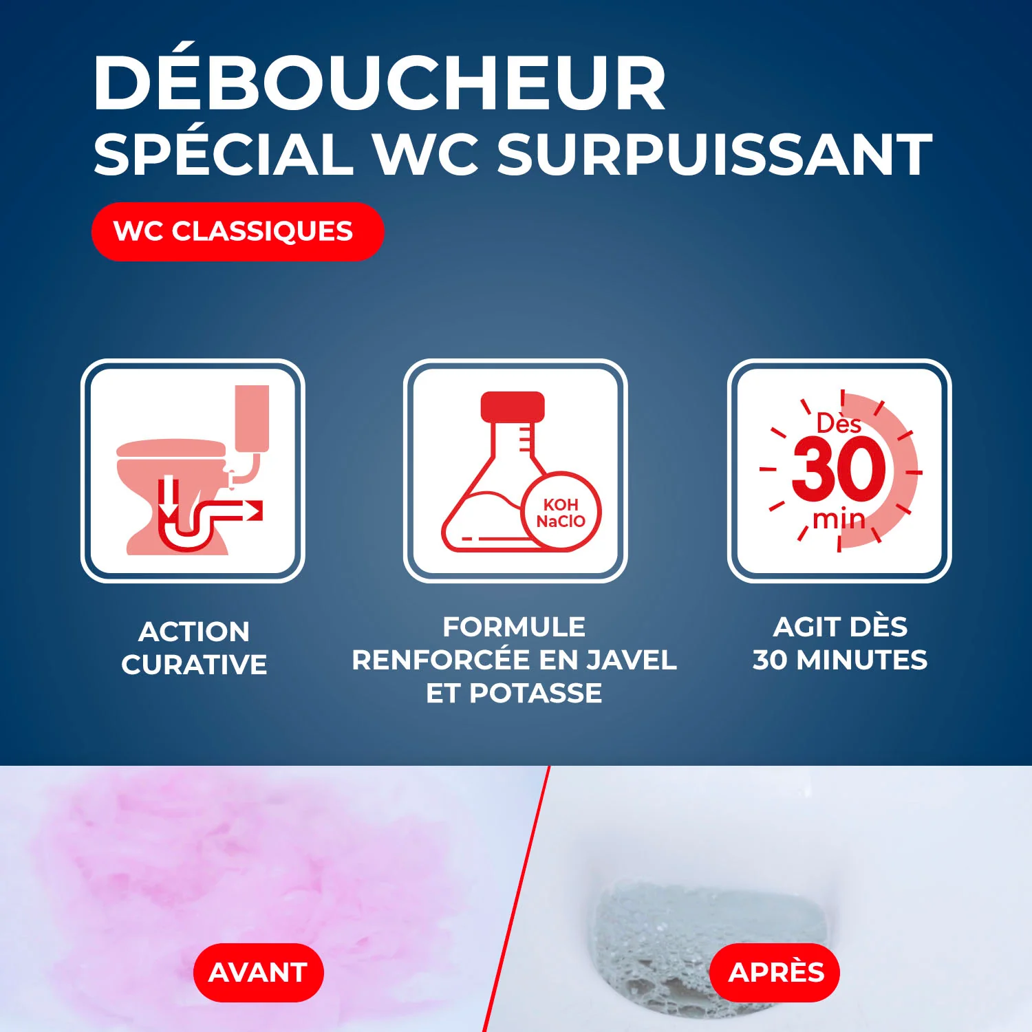 Sans acide sulfurique, sa formule à base de potasse et renforcée en javel débouche en dissolvant les matières organiques et le papier toilette.