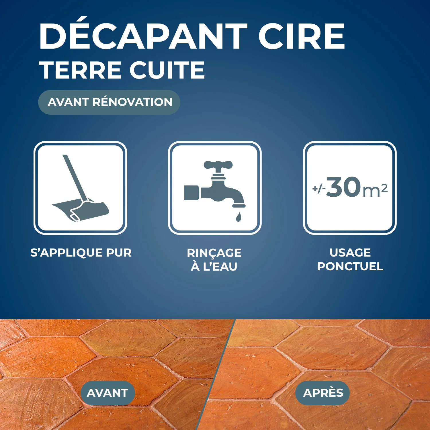 Le Décapant cire avant rénovation s'utilise sur les tomettes et terres cuites intérieures pour éliminer en profondeur les couches de cire à l'ancienne accumulées au fil du temps.
