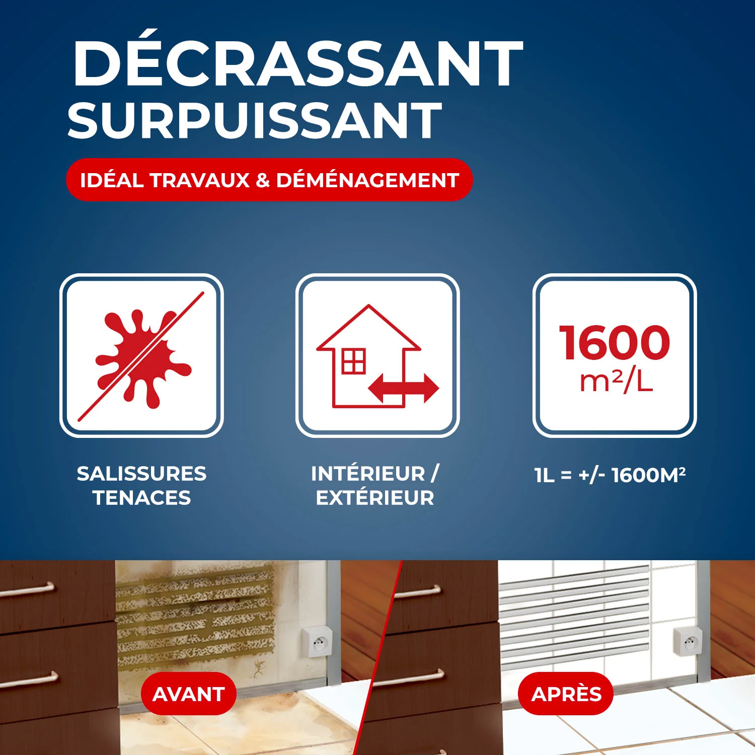 Le Décrassant extrême ultra-concentré décrasse à fond les surfaces lavables (sauf contre-indication du fabricant, Il est ultra-efficace contre les graisses alimentaires ou minérales, cambouis, traces de nicotine, salissures tenaces dans la cuisine, le garage (voiture), l’atelier (outillage), la terrasse et à l’extérieur de la maison..., Il convient autant pour l'intérieur que l'extérieur