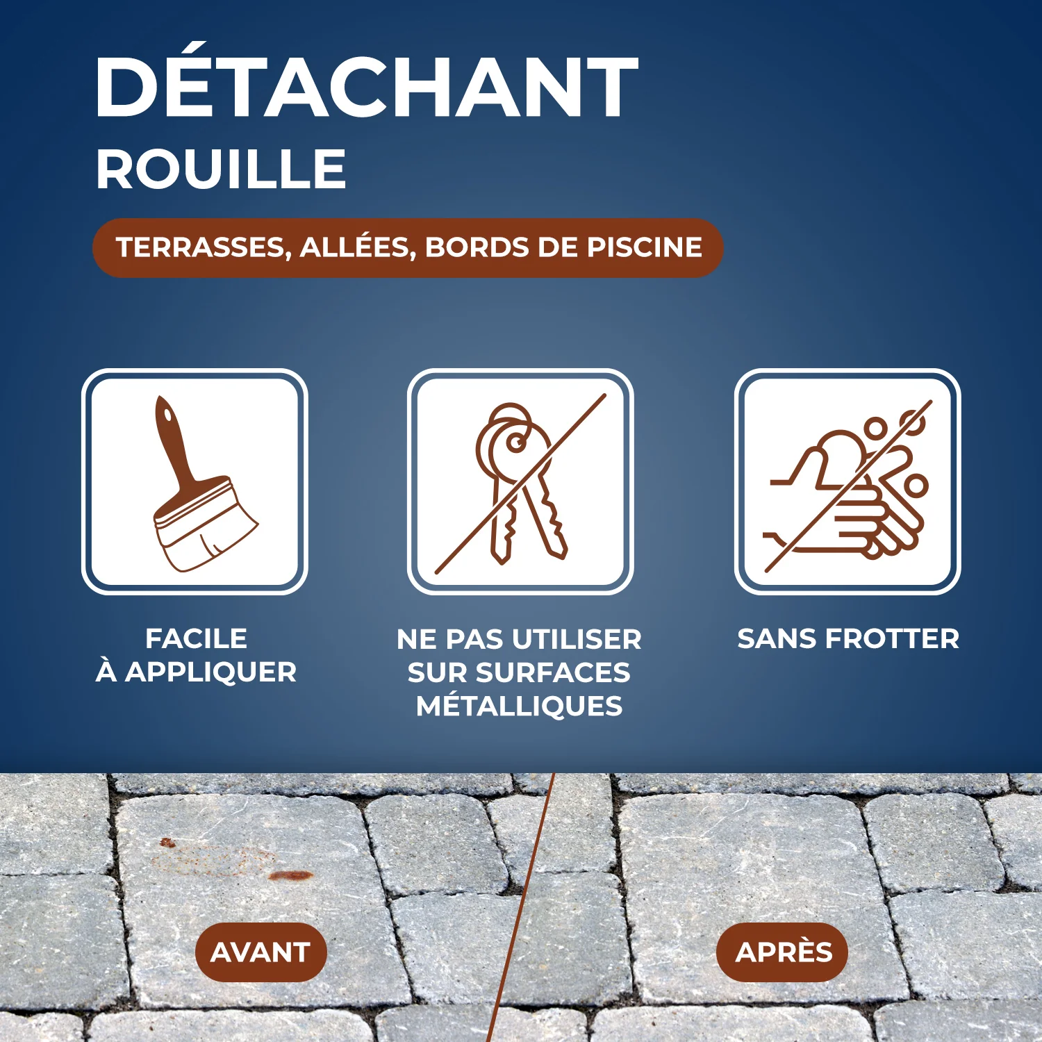 Le détachant rouille Starwax doté de sa formule concentrée élimine efficacement les traces de rouille, salpêtre et efflorescence sur tous types de sols ( carrelage, pavés auto-bloquants, dalles, gravillons...).