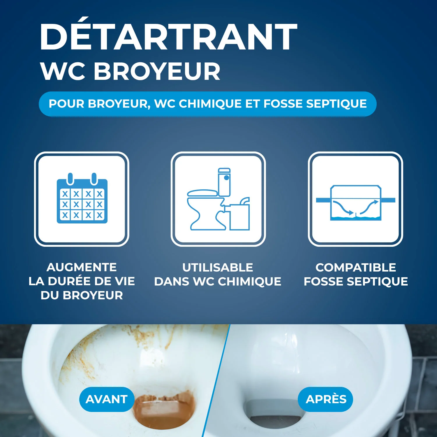 Le Détartrant Broyeur entretient le broyeur et détartre les cuvettes de WC reliées à des broyeurs tout en préservant les mécanismes, Il est également parfait pour détartrer les cuvettes de WC chimiques,