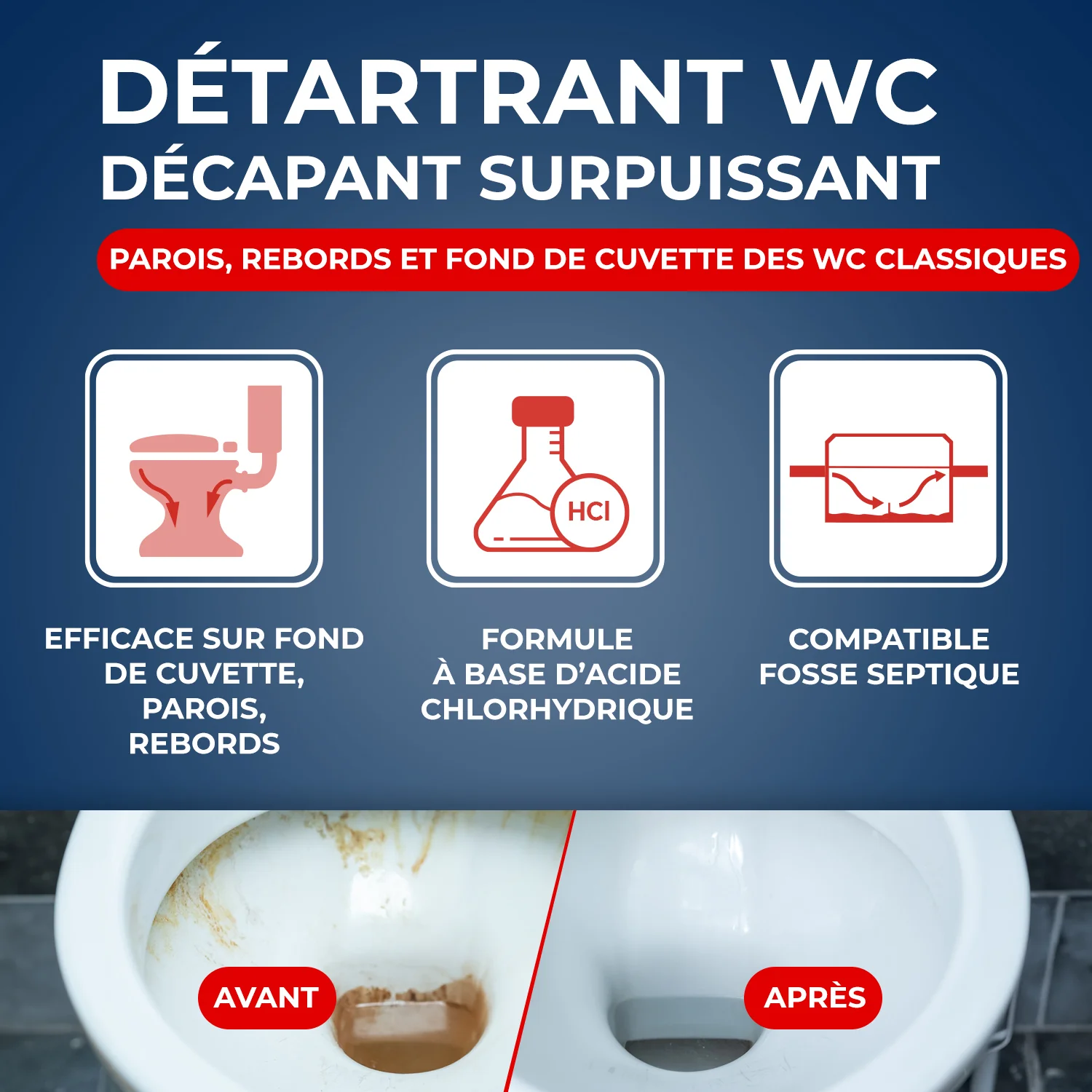 Grâce au Détartrant surpuissant gel, détartrez les parois et fonds de cuvettes de vos WC, Sa formule gélifiée permet une excellente adhérence et une application jusque sous les rebords grâce au bec directionnel, Utilisez-le quotidiennement pour prévenir les traces de tartre, Ce produit est compatible avec les fosses septiques à raison de deux utilisations par semaine, Utilisez alors un Entretien quotidien Starwax pour fosses septiques, En cas de WC très entartré, dirigez-vous vers le Détartrant surpuissant en poudre, Ce produit n'est pas compatible avec le WC broyeur, Utilisez le détartrant pour WC broyeurs de Starwax qui n'oxydera pas les métaux du mécanisme,