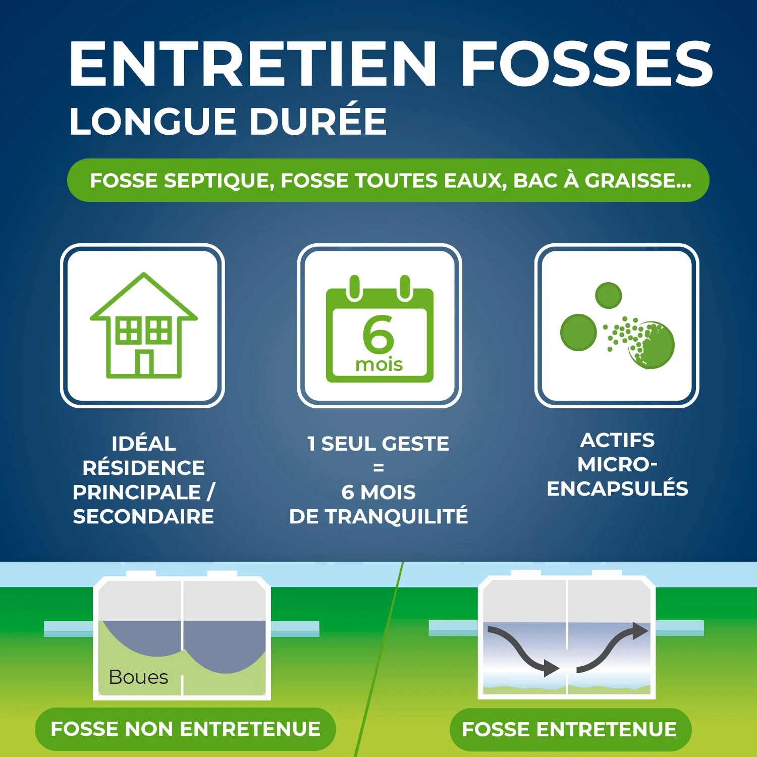 L'Entretien longue durée entretient les fosses septiques ou toutes eaux, bacs à graisses, puisards en continue grâce à sa formule biologique* avec micro-capsules.