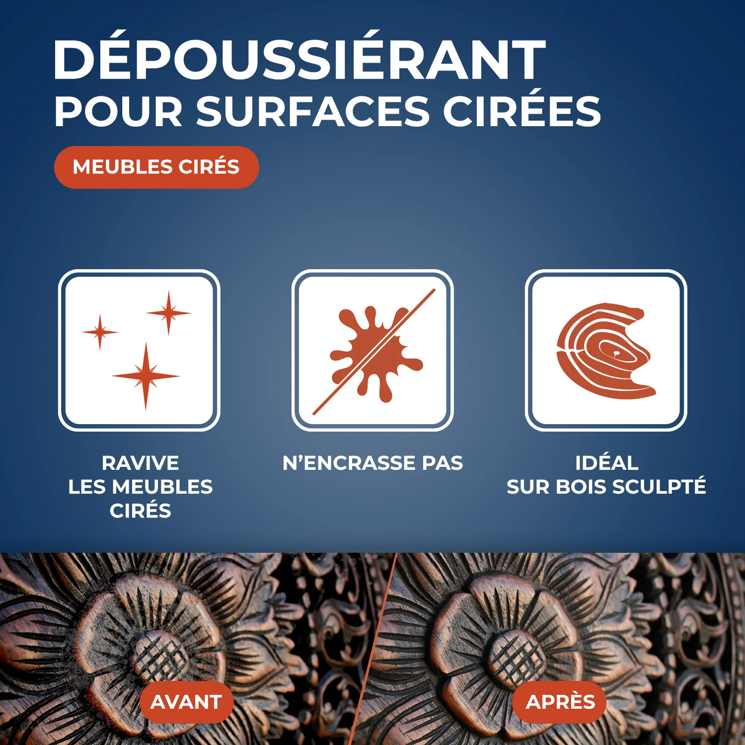 Le Nettoyant dépoussiérant cirant dépoussière et nettoie les meubles en bois cirés, Il redonne chaleur et luminosité sans encrasser le bois et laisse une agréable odeur de cire, Le Nettoyant dépoussiérant convient aux meubles cirés, neufs ou anciens, même très travaillés (sculptures, moulures...),