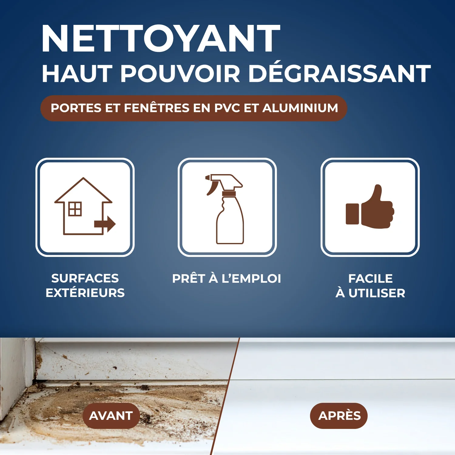 Prêt à l'emploi, il permet un nettoyage rapide et efficace des surfaces extérieures en PVC et aluminium.