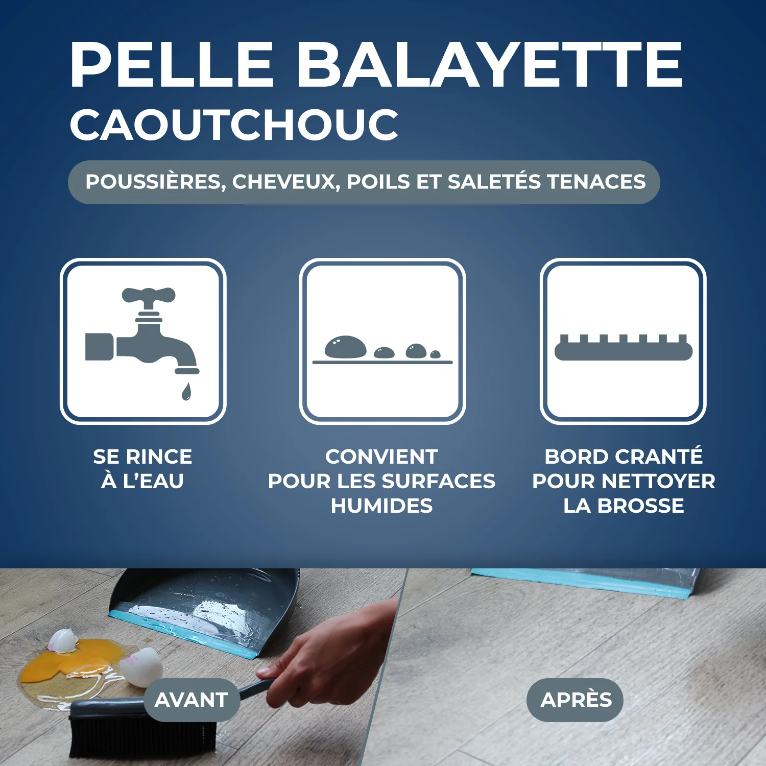 La pelle-balayette caoutchouc est idéale pour ramasser les miettes, les poils d'animaux et convient pour les surfaces humides.