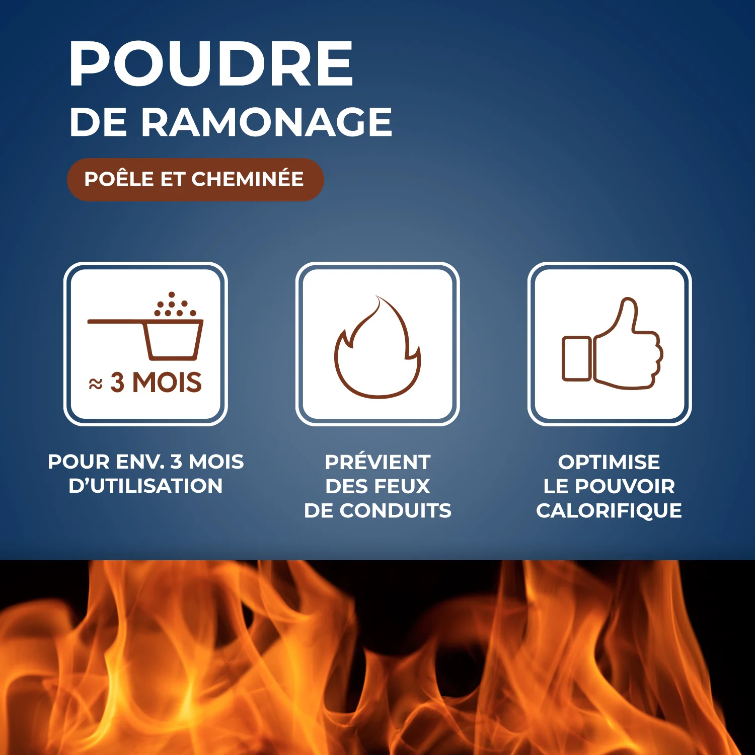 La poudre de ramonage pour poêle et cheminée s'utilise en curatif pour décoller les suies et goudrons et en préventif pour prévenir les feux de cheminée et optimiser le pouvoir calorifique de votre installation,