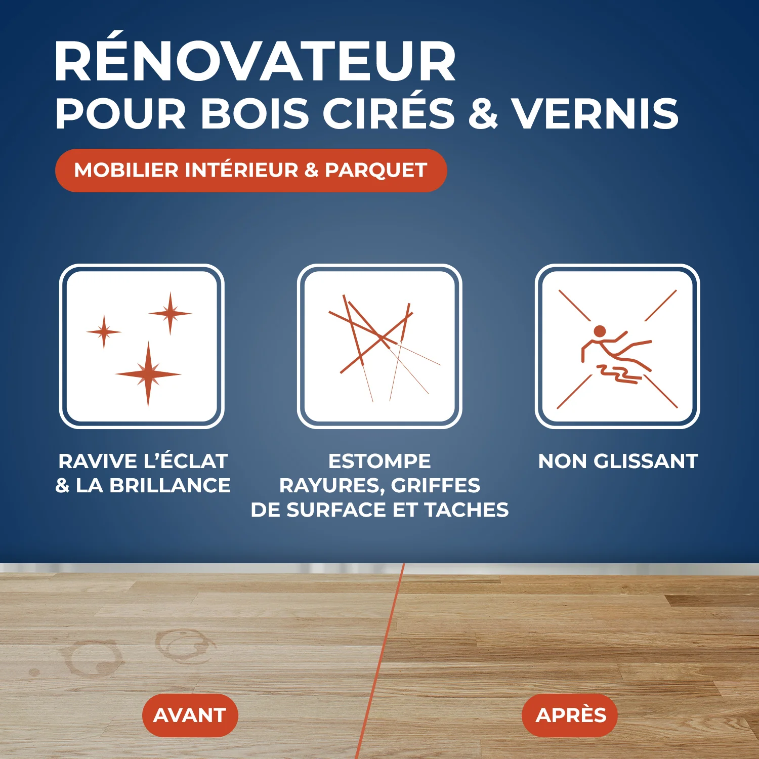 Le Rénovateur pour bois cirés et vernis nettoie en profondeur et élimine les excès de cire sur les meubles et parquets, Il estompe les rayures, griffes de surface et les taches en laissant un effet brillant, Le Rénovateur pour bois cirés et vernis redonne ainsi de l' éclat et ravive la teinte d'origine des surfaces en bois, Il s'utilise en intérieur et laisse les surfaces non glissantes,