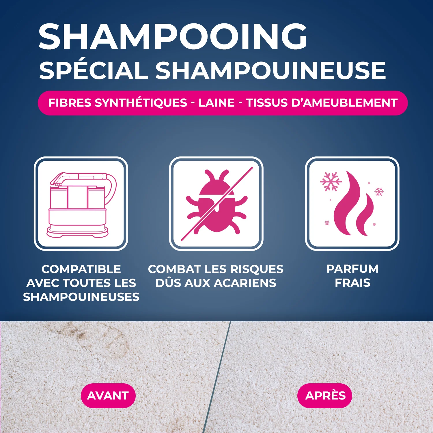Votre canapé ou tapis a perdu de son éclat ? Vous redoutez les tâches incrustées, les odeurs tenaces ou la poussière accumulée ? Le Shampooing spécial machines a été conçu pour nettoyer en profondeur, sans abîmer vos textiles. Grâce à sa formule concentrée, il agit efficacement dès les premières passes, tout en laissant une agréable sensation de propre et de frais. Il préserve l’aspect neuf de vos tissus, retarde le réencrassement et aide à limiter les risques liés aux acariens* — tout cela, sans rinçage. Compatible avec toutes les shampouineuses, y compris les modèles portatifs. Une solution idéale pour redonner vie à vos canapés, tapis, moquettes ou sièges de voiture.