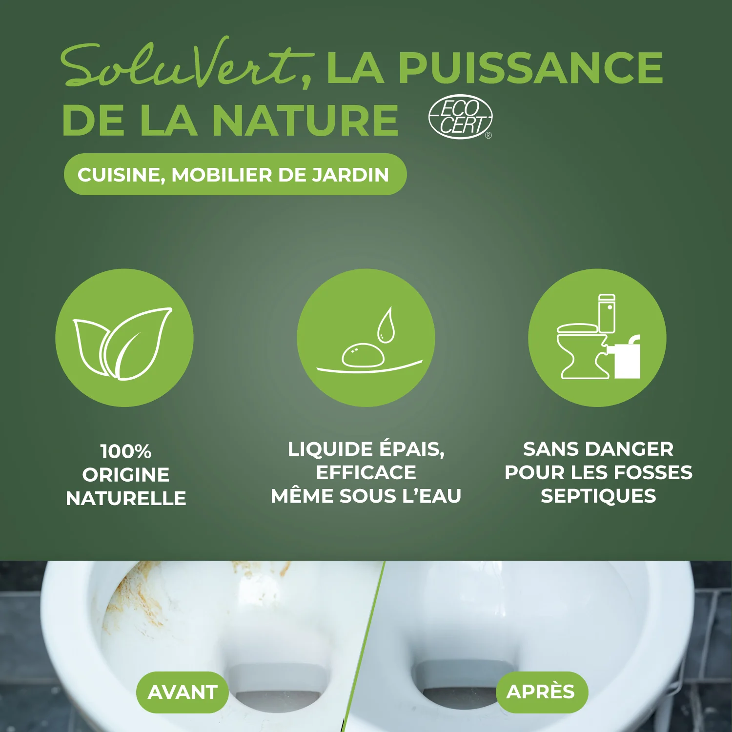 Formulé à partir d'ingrédients d'origine naturelle, sans colorant et labellisé Ecocert, le détartrant WC et broyeurs Starwax Soluvert élimine le tartre et les dépôts de calcaire sur les parois et même sous le niveau de l'eau.
